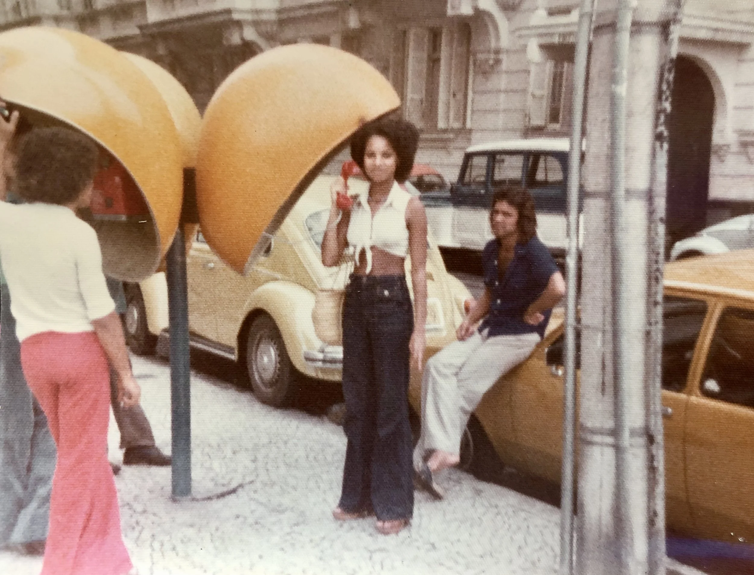 Michell’s mother standing by Chu Ming Silveira’s International “Orelhão” payphone in Brazil, 1974