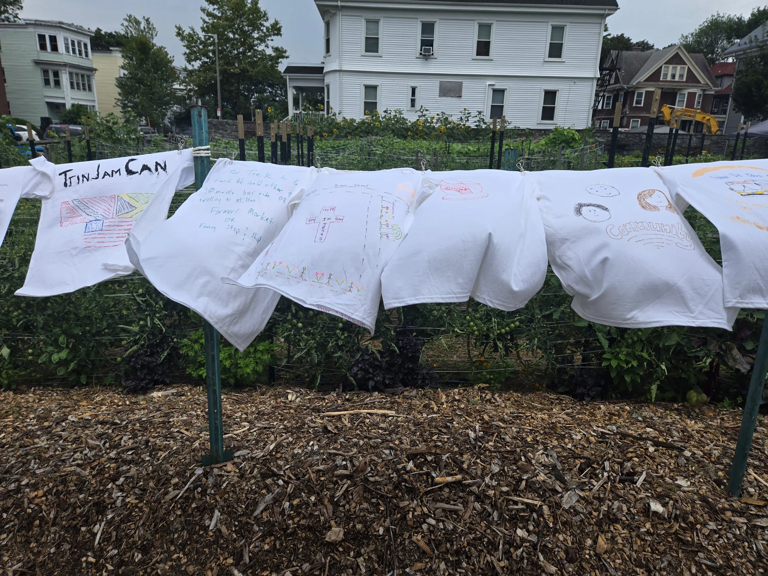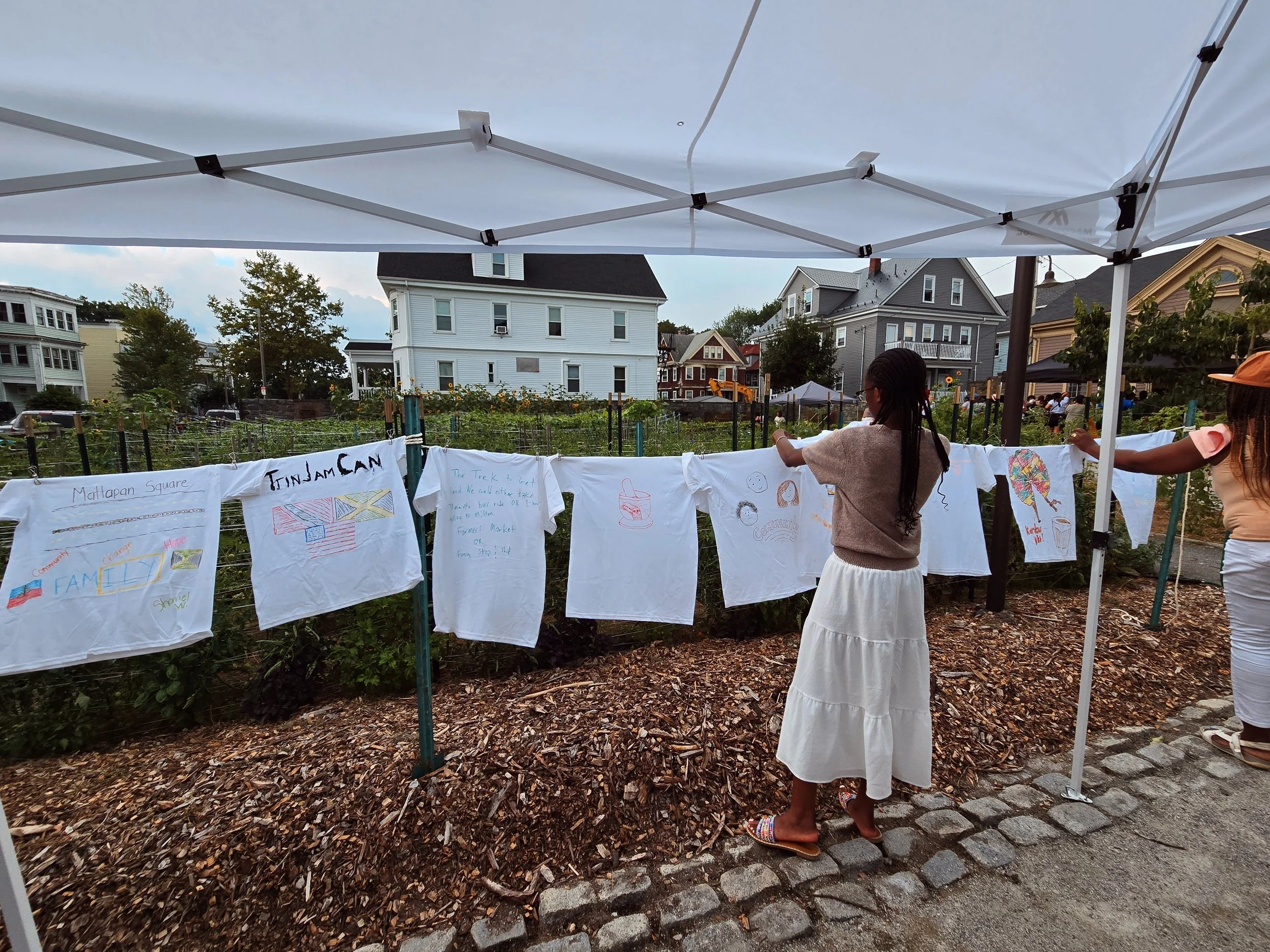 Inspired by the familiar Caribbean motif of backyard laundry lines hanging overhead, the first group of participants contributed to an installation strung across the Urban Farming Institute. After sharing and connecting over Caribbean values, attendees painted T-shirts with their lived experiences, frustrations, hopes, and dreams for a vibrant, culturally relevant, and equitable neighborhood.