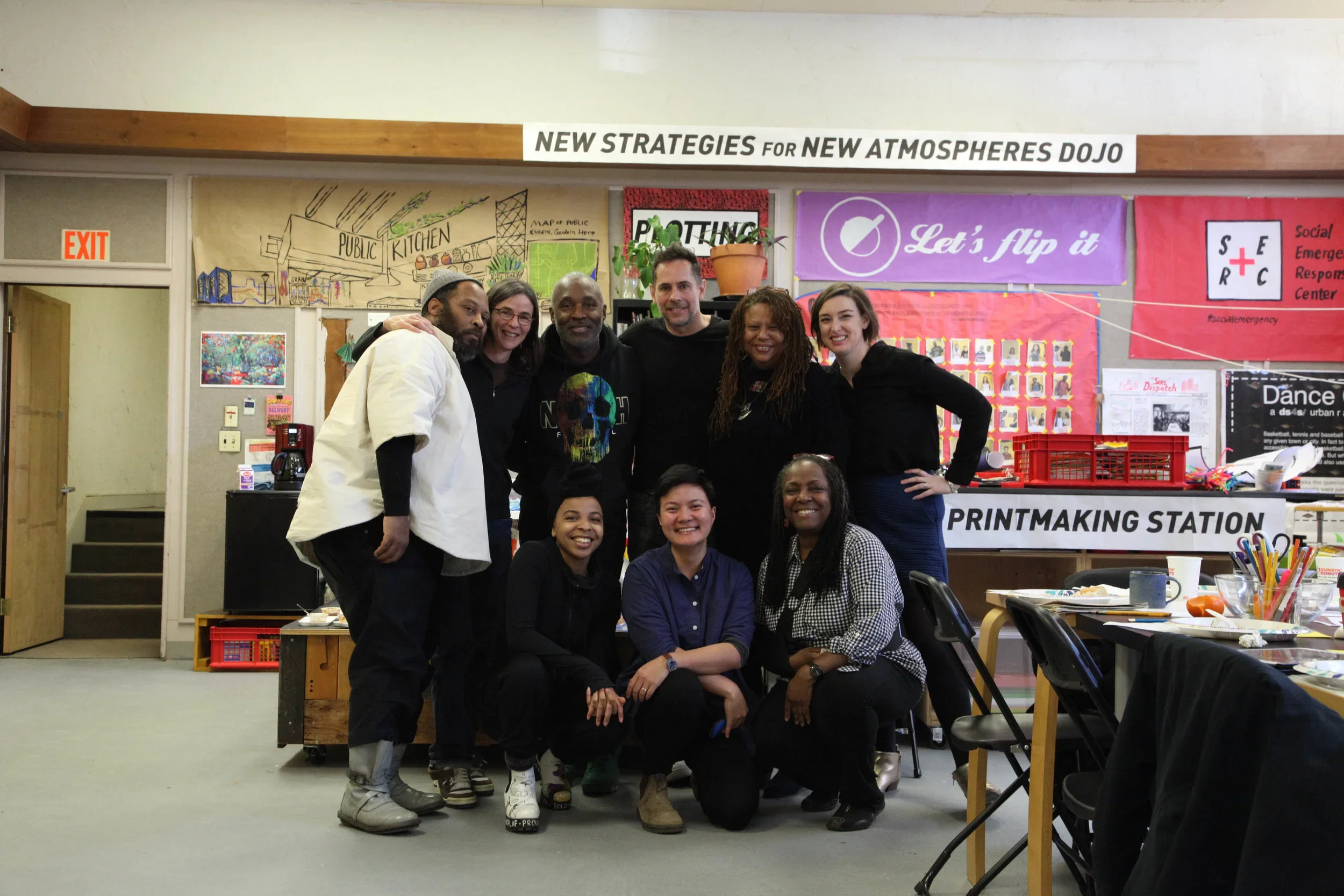 One of the early phases in the artistic process for Augment is doing the work of community engagement. Last Wednesday, Cave joined us along with community partner DS4SI’s Kenneth Bailey, Lori Lobenstine, and Ayako Maruyama, and local artists L’Merchie Frazier, Destiny Polk, and Ekua Holmes. (Missing were Jesse Cardoso and Wilton Tejada.) Together, we explored the themes of Augment and how it can ratify and amplify the work they and other members of Upham’s Corner are already doing to envision what this newly named “Arts and Innovation District” could be like if it prioritized local cultures, communities, and artists.