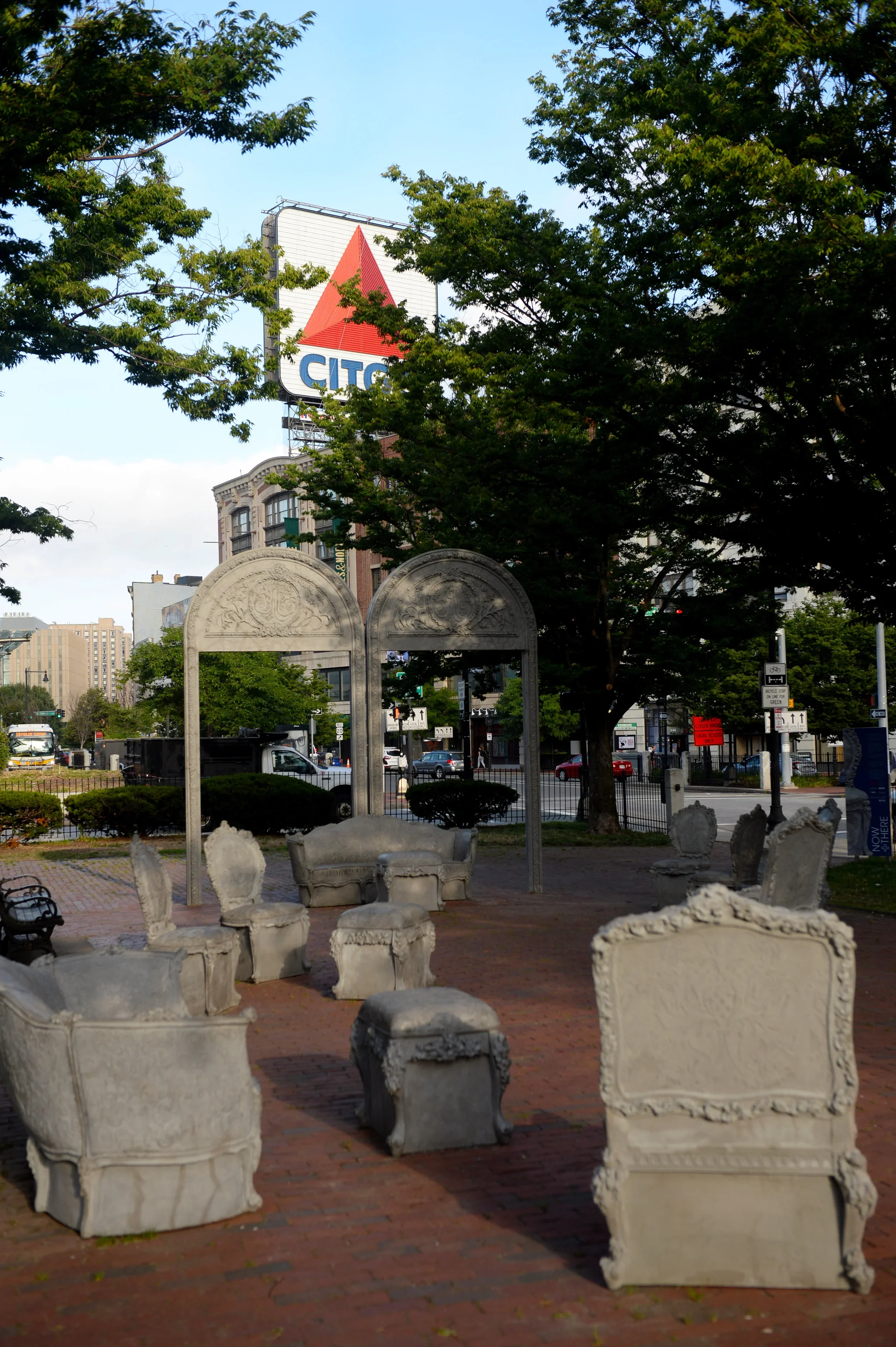 The Commonwealth Avenue Mall near Kenmore Square is classic Boston. This sliver of green space on the Comm Ave median is lined with iconic 19th century Back Bay brownstones. It’s a stone’s throw away from Fenway Park. It’s practically bathed in the neon glow of the Citgo sign. And now, it’s the site of Liz Glynn:Open House, Now + There’s latest public art project. But not only does this slice of parkland provide an ideal setting for contemplation in an open-air ruin of a ballroom -- it also has a fascinating origin that enriches the Open House’s potent message.