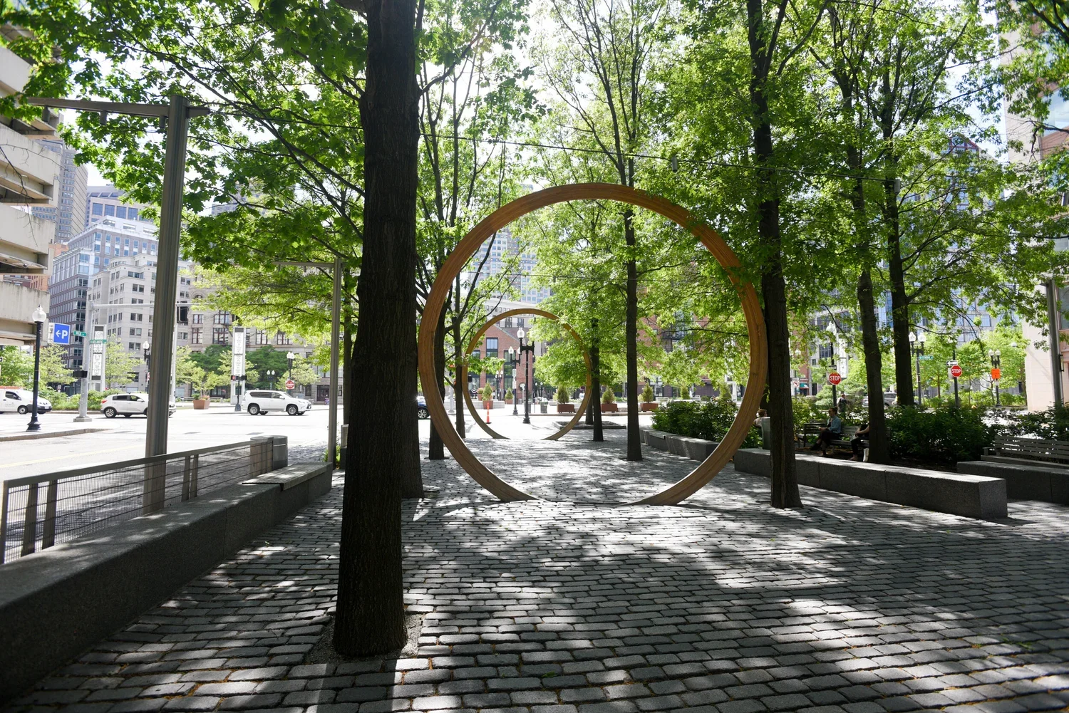 Growth Rings by Oscar Tuazon was conceived to draw attention to our relationship with nature considering our recent consciousness of climate change and the need for awareness of our inherent connection to the earth. Responding to the 24 oak trees in Central Wharf Park, the rings suggested natural cycles of life, creating a tangible and visible link between the surrounding elements, from the roots to the treetops.
