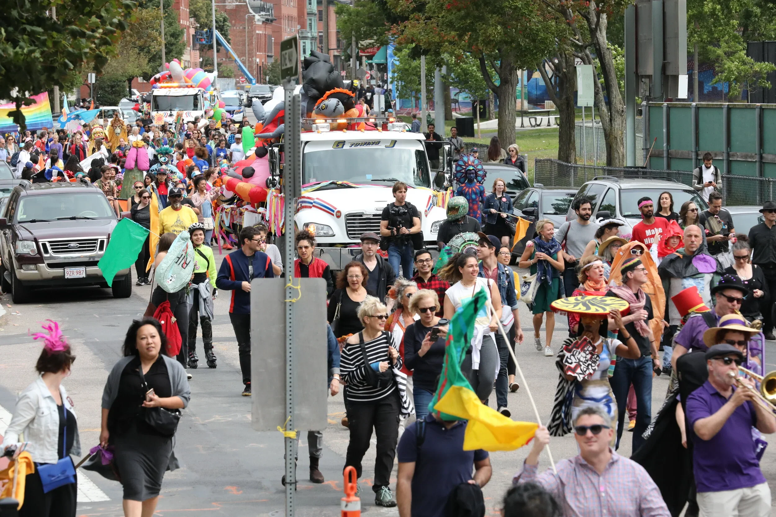10:57 am. A Saturday. I've just ushered two stilt walkers and a brass band onto Tremont Street, right in front of the Cyclorama at the BCA. "We have three minutes," a police officer tells me, which is how I know the time exactly. At 11am, Boston's first-ever JOY Parade kicked off its three-mile procession from the South End to Upham's corner, ushering Nick Cave's inflatable sculptures to its next location, 555 Columbia Road. Conceived as a jubilant cavalcade of local performers, artists, and everyday Bostonians, the JOY Parade not only transported the sculptures but was, in and of itself, an artwork. A performance activating Nick's work and the artistry others, it also engaged a framework of social infrastructure, police included.