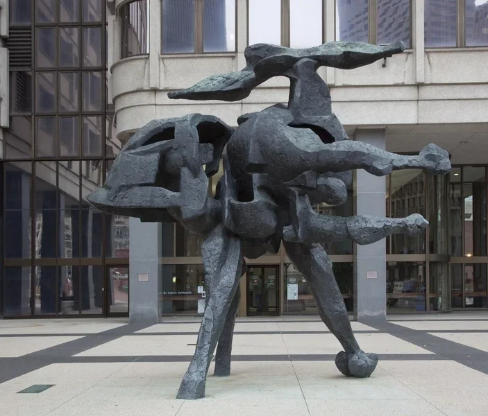 To understand the 80s, we have to go back to the 1960s; another turbulent decade, but one in which social issues like poverty, racism, and classicism were seriously addressed through Great Society Programs. Federal money supported art and artists (working in public or not) through the National Endowment for the Arts (NEA). And city-based corporations, seeking to adorn their glass, Post-Modern skyscrapers, financed large-scale abstract sculptures, placing them in expansive, publicly accessible plazas. Think the Chicago Picasso, or, locally, Thermopylae (1966) outside of the JFK Building in City Hall Plaza.