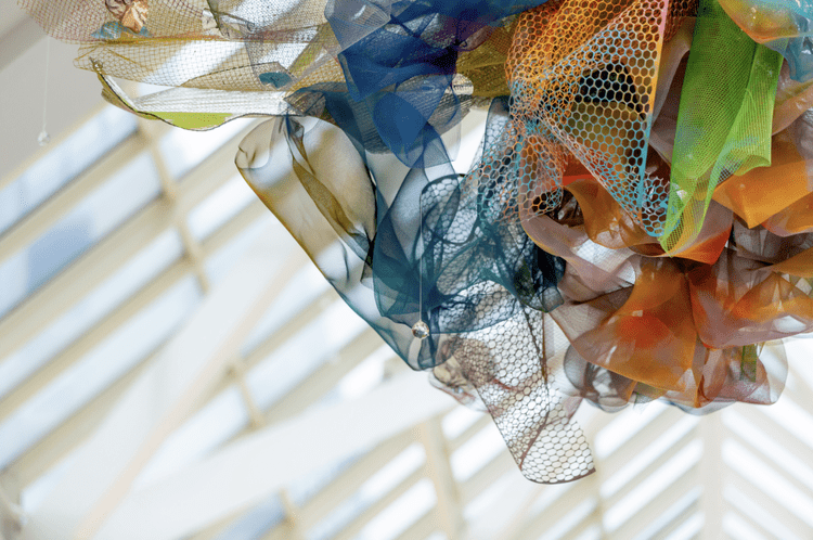 Cicely’s distinct “astral forms” and iridescent window films began to punctuate the sky through the windows of Prudential’s arcades. In the Boylston street entrance, glittery golden rainbows adorned with tulle, orbs, and crystals now cascaded from the ceiling, soon after, the abstracted plexiglass constellation in Center Court jolted into focus.