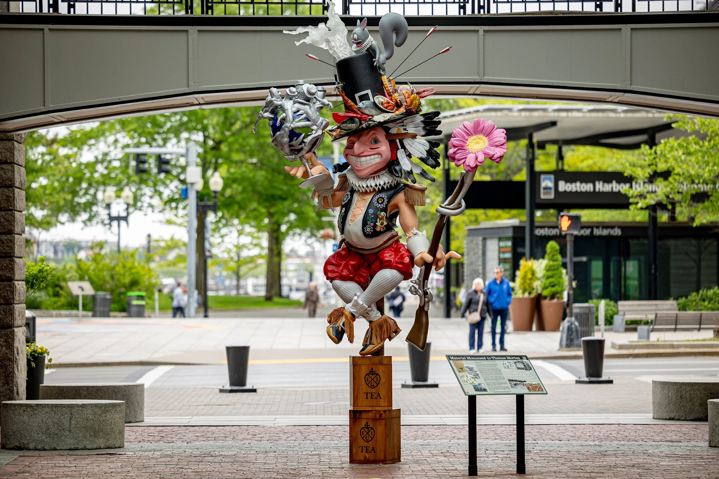 Begin your Downtown Detour at Patrick Martinez’s “Cost of Living”. Stroll down Arch Street, turn onto Milk Street, and follow State Street until you reach Marketplace Center. There, you’ll witness New Red Order’s “Material Monument to Thomas Morton,” waiting to surprise you.